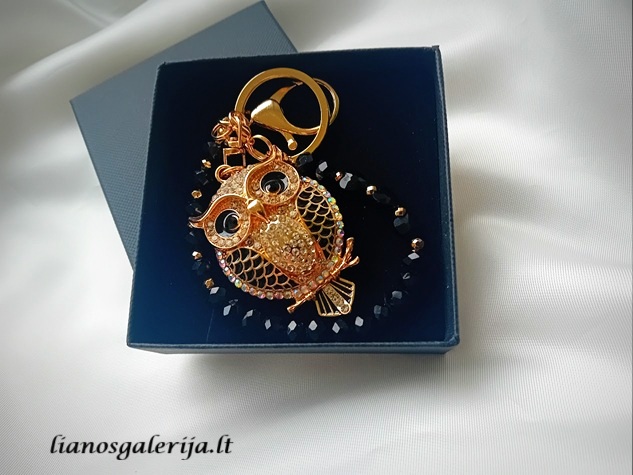 3,8 x 6 cm 3D raktų pakabukas,dekoruotas sintetiniais kalnų krikštolo akmenukais, puoštas 8 mm juodų kristalu vėriniu, bendras ilgis 13 cm