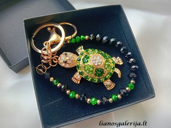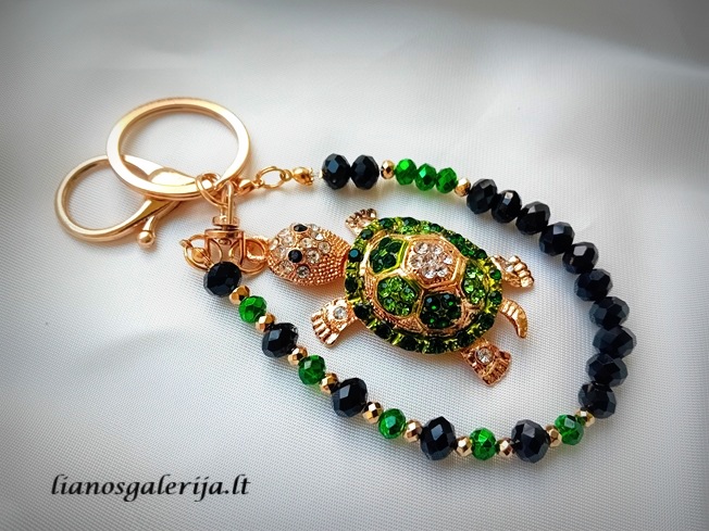 6 x 4,2 cm pakabukas vėžlys, dekoruotas sintetiniais kalnų krikštolo akmenukais, puoštas 8 mm juodų ir žalių kristalu vėriniu, bendras ilgis 13 cm. Tinka rankinių, piniginių, automobilių, raktų papuošimui.